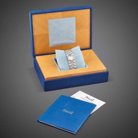cassa di forma in oro bianco 18kt, fondello serrato con viti, corona marcata, lunetta impreziosita da due file di diamanti, quadrante madreperla, grafica nera, indici con brillanti, movimento al quarzo, bracciale a maglie in oro bianco 18kt, lungh. interna cm 19, chiusura doppia deployant marcata Piaget, vetro minerale, gr. 106. Dim. mm 26x18. Corredato di scatola e garanzia.