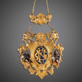in oro giallo 18kt, con pendente a forma di blasone recante al centro un monogramma su sfondo in smalto blu, affiancato da due putti in acciaio che trattengono ghirlande e diamanti taglio vecchio per ct 0.20 circa, firmata "R.Luca", lungh. cm 46,5, gr. 24