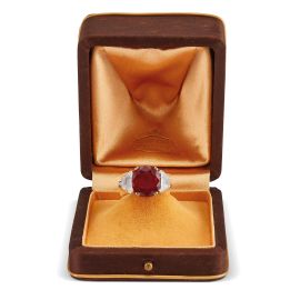 in oro giallo e bianco 18kt, impreziosito al centro da un rubino thailandese taglio ovale di ct 5.70 circa, affiancato da due diamanti taglio fantasia per ct 1.90 circa, punzoni 750 e del fabbricante, mis. 14/54, gr. 5. Corredato di certificato IGN del 18/09/2024 attestante le caratteristiche e l'origine del rubino.