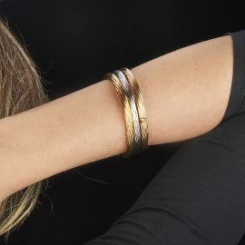 in oro giallo, bianco e rosa 18kt, superfici con scanalature ondulate, punzoni 750 e del fabbricante, diam. interno cm 6, circonferenza interna cm 18, gr. 72 complessivi