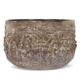 缅甸 十九世纪 银錾刻乘象人物故事纹巨钵 直径37厘米 高25厘米 重3900克