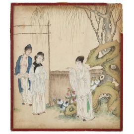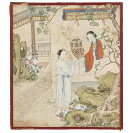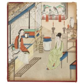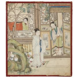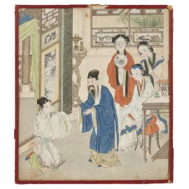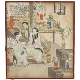 Affascinante serie di sette dipinti su carta, montati sotto vetro, raffiguranti scene di vita quotidiana in ambienti domestici riccamente decorati. Ogni opera rappresenta figure nobiliari e domestici in vari momenti di interazione e attività, catturando con dettagli minuziosi abiti, arredi e atmosfere tradizionali. Questi preservati con cura grazie alla montatura protettiva in vetro.