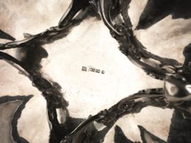 in argento sbalzato, quattro sosteni a volute di foglie, foglie che si ripetono lungo il profilo, cm 31x26, g 835