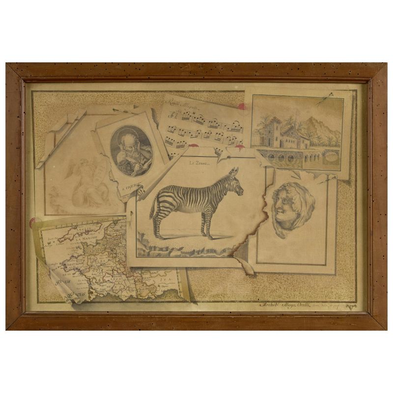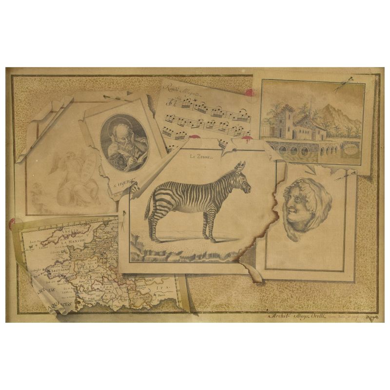 TROMPE L'OEIL CON INCISIONE SPARTITO E CARTA GEOGRAFICA