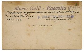 al verso, in alto al centro, a penna e inchiostro bruno: "Confermo e garantisco autentica disegno di Silvestro Lega / 28.7.964 Aldo Gonnelli"; timbro "Mario Galli Raccolta d'Arte"; timbro "p. Saletta Gonnelli"