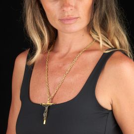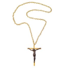in oro giallo 18kt, da cui pende un grande pendente in oro e metallo a forma di crocifisso, punzoni 750 e del fabbricante "Giani & Venturi", dim. cm 4,5x7 circa, lungh. cm 59, gr. 72
