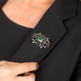 EMERALD AND DIAMOND FLOWERING BRANCH-SHAPED BROOCH IN SILVER AND GOLD