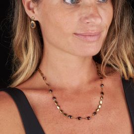 in oro giallo 18kt, composta da una collana e un paio di orecchini pendenti, impreziosita da granati taglio ovale per ct 16 circa, lungh. collana cm 49, lungh. orecchini 2,5, chiusura a farfallina, gr. 19 complessivi