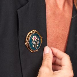 in oro e argento, con al centro un fiore su base in diaspro sanguigno impreziosito da perle di mm 3 circa e rose di diamante, dim. cm 3,5x4,5, gr. 20