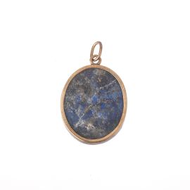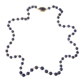 in oro giallo 18kt, composta da una serie concatenata di sfere in lapislazzuli di mm 5 circa, lungh. cm 65, gr. 31; accompagnata da un pendente in oro 14kt, parte centrale in lapislazzuli con motivo figurato a rilievo, dim. cm 2x2,5, gr. 3
