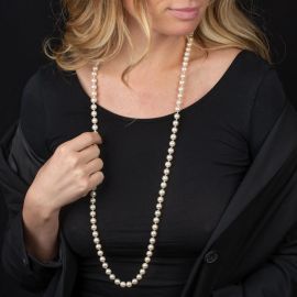 composta da un filo di perle di mm 8 circa, fermatura in oro giallo e bianco 18kt, con diamanti taglio brillante per ct 0.20 circa, punzoni 750 e del fabbricante "1801 AL", lungh. cm 97, gr. 98