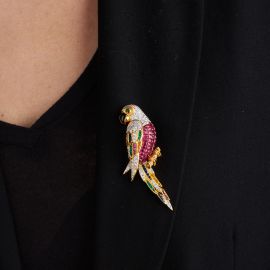 MULTI GEM PARROT SHAPED BROOCH IN 18KT YELLOW GOLD