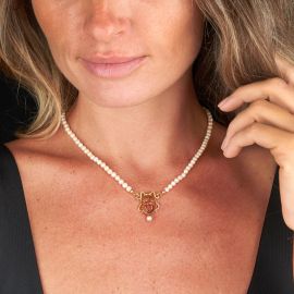 composta da un filo di perle di mm 4 circa, fermatura e pendente in oro con al centro un cammeo in ambra, lungh. cm 41, gr. 12