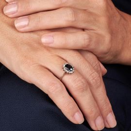 in oro bianco 18kt, impreziosito da uno zaffiro taglio ovale di ct 1.30 circa, circondato da una fila di diamanti taglio huit huit per ct 0.30 circa, punzone 750, mis. 15/55, gr. 3
