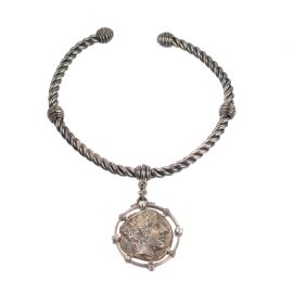 in argento, da cui pende un ciondolo con moneta, circondato da quattro diamanti taglio vecchio per ct 0.40 circa, diam. interno cm 7, dim. pendente cm 2,5x3,5, gr. 44; accompagnato da una spilla in oro 9kt, decorata in smalti policromi, con al centro una miniatura raffigurante una scena galante (difetti), dim. cm 3x3,5 circa, gr. 7