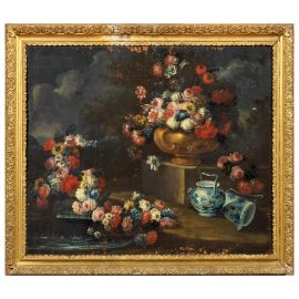 NATURA MORTA CON VASO DI FIORI SU PIEDISTALLO E VASELLAME