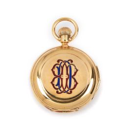 cassa in tre parti in oro giallo 18kt, punzoni francesi, coperchio recante monogramma decorato in smalti policromi (difetti), quadrante bianco in porcellana (difetti), grafica nera, lancette Luigi XV, numeri arabi, secondi a ore sei, movimento a carica manuale, vetro plastica, gr. 130. Diam. mm 52