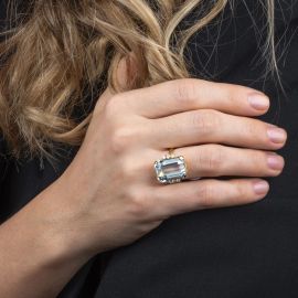 in oro giallo 18kt, impreziosito da un'acquamarina centrale taglio ottagonale di ct 11 circa affiancata da diamanti taglio brillante per ct 0.20 circa, punzoni 750 e del fabbricante, mis. 14/54, gr. 8