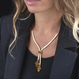 in oro giallo 18kt , realizzata a maglie piatte con motivo a cordicella, elementi pendenti impreziositi da quarzi citrini taglio rotondo, lungh. cm 45, gr. 62