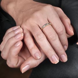 in oro giallo 18kt, impreziosito da una fila di diamanti taglio carré per ct 0.55 circa, mis. 18/58, gr. 2