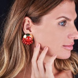 in oro giallo 18kt, impreziositi da spole centrali in corallo e boules in corallo di mm 6 circa, chiusura a clip, gr. 34 complessivi