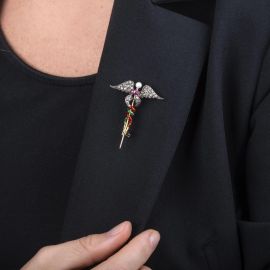 MULTI GEM ENAMELLED BROOCH IN GOLD AND SILVER
