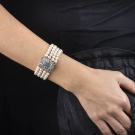 in oro bianco 18kt, realizzato a quattro fili di perle di mm 5 circa, fermatura impreziosita da zaffiri e smeraldi (uno mancante) taglio rotondo per ct 1 circa, punzone 750, diam. cm 6 circa, circonferenza interna cm 15, gr. 44