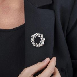 in oro bianco 18kt, impreziosita da perle di mm 3 circa e pietre sintetiche incolore, punzoni 750 e del fabbricante, dim. cm 3,5x3,5, gr. 7