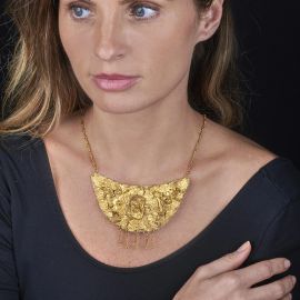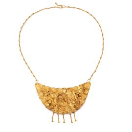 in lamina d'oro 24kt, realizzata con un filo d'oro che forma maglie ritorte ed un grande pettorale semilunato con fiori stilizzati a rilievo, al centro il volto della dività etrusca "Tinia" ed elementi pendenti, lungh. cm 53, gr. 44