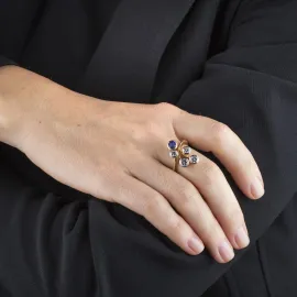 in oro giallo 18kt, impreziosito da uno zaffiro taglio ovale di ct 0.60 circa e diamanti taglio brillante per ct 1 circa, mis. 19/59, gr. 7