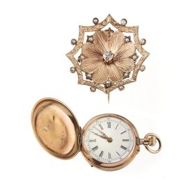 cassa in oro 14kt, con putto decorato in smalto (difetti) e rose di diamante, quadrante porcellana, numeri romani, movimento a carica manuale (non funzionante), punzoni svizzeri e 14kt, diam. mm 29, gr. 23; accompagnato da una spilla in oro 14kt, lavorata a incisione e a traforo, di forma convessa, impreziosita da microperle e al centro da un diamante taglio vecchio di ct 0.30 circa, dim. cm 3,5x3,5, gr. 6