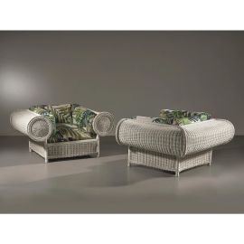 in vimini nei toni del bianco, cuscini imbottiti e rivestiti in tessuto nei toni del verde