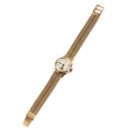 cassa italiana in oro giallo 18kt, fondello a pressione, quadrante argentè ristampato (difetti), numeri arabi, secondi a ore sei, movimento a carica manuale, bracciale italiano in oro giallo 18kt a maglia tessita con chiusura a scomparsa, lungh. cm 17,5, vetro plastica, gr. 36. Diam. mm 20