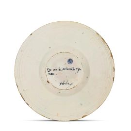 in maiolica dipinta in policromia con blu di cobalto, verde ramina in due toni, bruno di manganese, giallo antimonio nei toni del giallo e dell’arancio. Sotto il piede in bruno di manganese: De inoet Athama(n)te i(n)fu/riati. /FabulaY ed etichetta di provenienza FLORENCE TACCANI ANTICHITÀ – MILANO; diam. cm 26,5, diam. piede cm 9, alt. cm 2,7