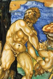 Atamante, figlio di Eolo, sposò in seconde nozze Ino e dalla loro unione nacquero Learco e Melicerte. L’uomo accettò di allevare il piccolo Dioniso, nato dall’unione fra Giove e Semele, affidato dallo stesso Giove ad Ino in quanto zia del piccolo. Ma Giunone, adirata, fece impazzire Atamante tramite l’opera della furia Tisifone, che lo spinse ad uccidere il figlio Learco. Ino per il dolore si gettò in mare con l’altro figlio Melicerte e insieme si tramutarono nelle due divinità marine Leucotea e Palemone. Una raffigurazione del mito ci deriva da un’incisione nella versione volgare di Giovanni dei Bonsignori (Ovidio Methamorphoseos vulgare, Venezia 1497, fig. 32v), che mantiene la scansione cronologica degli eventi, e a cui si affiancano le variazioni nelle edizioni successive, come quella di Jean de Tournes (La Métamorphose d’Ovide figurèe, Lione 1557) con xilografie di Bernard Salomon, che furono spesso utilizzate in maiolica. L’impostazione narrativa è quella della tradizione, ma siamo avvezzi all’abitudine di Xanto Avelli di utilizzare per la sua opera fonti incisorie differenti, ed anche in questo caso il pittore rovigese ha sapientemente esercitato la sua arte attraverso l’uso di personaggi tratti singolarmente da diverse incisioni.