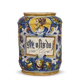 Il grande albarello ha corpo cilindrico, rastremato verso il basso, con spalla e piede fortemente arrotondati e divisi da una netta demarcazione sottolineata da una filettatura a rilievo; il collo cilindrico è basso terminante in un orlo appena appena estroflesso. La decorazione, che interessa l’intera superficie, vede sul fronte al centro un alto cartiglio rettangolare racchiuso in una complessa cornice, al cui centro campeggia la scritta in caratteri gotici Mostarda.f, sormontata da un medaglione ovale con ritratto maschile barbato, rivolto a sinistra e con il capo coperto da un cappello a sacco di colore bruno violaceo. Sotto il cartiglio è dipinto invece un viso maschile a guisa di mascherone, mentre ai lati due splendide figure di sirene, delineate con sapienza, spiccano nel fondo intessuto dal caratteristico motivo a maglie stette con girali fogliate, piccoli frutti, ghiande, foglie di acanto e piccole corolle multipetalo su fondo blu cobalto decorato a sgraffio. Sulla faccia opposta, entro una cornice robbiana realizzata in una inconsueta versione a foglie appuntite di colore blu legate da un nastro sottile accompagnato da piccoli frutti tondeggianti e centrata da corolle aperte, spicca la figura di un condottiero con lorica e capo ornato da elmo piumato, posto su uno sfondo giallo intenso. Un ritratto con impostazione analoga si ritrova in una boccia della bottega di Mastro Domenico esposta nella mostra della Galleria Canelli nel 1990 (n. 16), ma la figura del nostro albarello rispecchia la grafia veloce e asciutta associata alla mano del maestro della bottega. Un ritratto di uomo barbato presente in un esemplare della collezione della Fondazione Cini di Venezia costituisce un esempio stilistico nella modalità di delineare questo tipo di ritrattistica, e la qualità è senza dubbio la stessa dei ritratti presenti in una splendida boccia della collezione Perez di Palermo. Tuttavia è nelle figure di sirena e in alcuni dettagli, testimoni di un sapiente dominio della pittura, che ci pare di ravvisare la possibile opera del maestro, o comunque di un pittore di alta mano, nella realizzazione dell’opera. Si vedano a confronto soprattutto i piatti istoriati di Mastro Domenico, tre dei quali all’Herzog Anton Ulrich Museum di Braunschweig di Amburgo ne recano la firma autografa. In questo caso l’elevatissima qualità dell’opera e la realizzazione morfologica e decorativa suggeriscono una committenza importante.