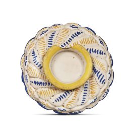 in maiolica dipinta in policromia con blu di cobalto, giallo, giallo arancio, bianco di stagno e manganese; diam. cm 20,5, diam. piede cm 10,6, alt. cm 5,8