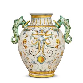 in maiolica decorata in policromia con azzurro, blu, verde, giallo, giallo-arancio e bruno di manganese; alt. cm 31,4, diam. bocca cm 12, diam. piede cm 12,4