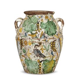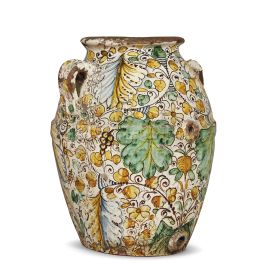 in terracotta smaltata e dipinta in policromia con giallo, giallo arancio, verde ramina, blu di cobalto e bruno di manganese. Lettera S entro circolo sotto entrambe le anse; alt. cm 44, diam. bocca cm 22, diam. piede cm 22,5