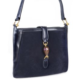 Pezzo particolarissimo per amanti del vintage, in camoscio blu marino, fianchi, rifiniture e tracolla in pelle tono su tono. Accessori interni da favola: specchietto e mini portafoglio. Chiusura in legno e smalto.