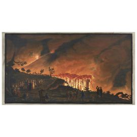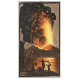 Sir William Hamilton, in qualità di inviato britannico a Napoli, si trovava in una posizione privilegiata per studiare i vulcani della regione. Scalò il Vesuvio più di venti volte, assistendo di persona a una delle sue eruzioni. Desideroso di documentare questi fenomeni, commissionò all’artista Pietro Fabris una serie di disegni raffiguranti vulcani attivi e dormienti, insieme a dettagliati schizzi geologici. I vividi colori applicati alle tavole incise furono stesi “sotto il controllo dell’Autore”, conferendo alle immagini un effetto scenografico di grande impatto visivo.