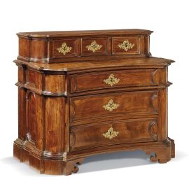 in noce, piccola alzata a tre piccoli allineati poggiante su piano aggettante leggermente sagomanto, fascia sottopiano a un cassetto e ulteriori due cassetti sul fronte, grembiale liscio e piedi a mensola; bocchette in bronzo dorato ad impreziosire i cassetti, cm 67x79x43