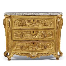 in legno intagliato e dorato con piano in marmo variegato grigio, di linea leggermente sagomata, fronte a tre cassetti centrati da riserve mistilinee ad ospitare decori vegetali, architettonici e animali su fondo bulinato e conchiglia sotto la bocchetta centrale, angoli aggettanti a forma di voluta fogliacea impreziosita da motivi floreali; anche i fianchi, di forma concava presentano medesime decorazioni entro coppia di formelle mistilinee; grembiale centrato da ricca conchiglia rocaille e piedi a ricciolo stilizzato su sfera schiacciata, cm 91x120x53