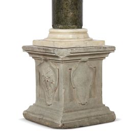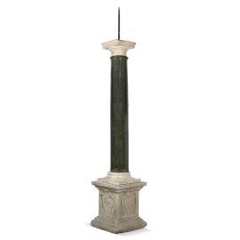 in pietra e marmi vari, composto di elementi probabilmente non pertinenti. Bel basamento a plinto quadrangolare decorato sulle quattro facce con scudi, tre dei quali contenenti gli stemmi delle famiglie fiorentine Medici, Minerbetti e Tassi e il quarto l’iscrizione VGO MINERBETTI TASSI ANNO MDCXXXXII; sulla base una colonna in marmo verde completa di piede e capitello in marmo bianco, sormontata da punta in ferro battuto; cm 158x35x35