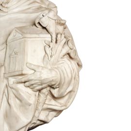 scultura monumentale in marmo raffigurante il santo a mezza figura vestito dell’abito domenicano, mentre con la mano sinistra sorregge la raffigurazione di una chiesa e un giglio; cm 127x87x50