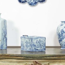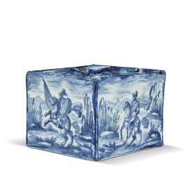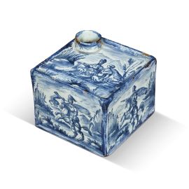 in maiolica dipinta in monocromia, corpo a bottiglia di forma cubica con imboccatura circolare appena rilevata e collocata vicina ad un angolo. Di definizione incerta, potrebbe costituire un esempio di calamaio di grandi dimensioni o comunque un contenitore a bottiglia anomalo, con il cannello spostato dal centro a favorire lo sversamento del liquido. L’opera presenta una decorazione a monocromia blu che raffigura sui lati dei cavalieri su destrieri al galoppo diversificati per armi e funzioni: un cavaliere a spada sguainata, un trombettiere, un alabardiere e un altro cavaliere che procede al passo; sulla faccia superiore invece un uomo e una donna seduti indicano l’orizzonte. Mentre tutte le figure sembrano trarre spunto da incisioni, forse dalla Gerusalemme Liberata, la forma e la raffinatezza del decoro confermano l’originalità e rarità dell’opera. Il fondo è privo di smalto; cm 12,5x14,4x14,2