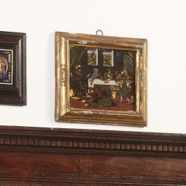 dipinta ad olio su vetro raffigurante l'episodio evangelico di Maria Maddalena che lava ai piedi di Gesù in casa del Fariseo, cm 21,5x25,8 entro cornice in legno dorato, cm 29,6x34,7