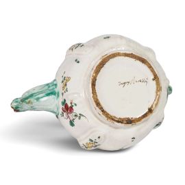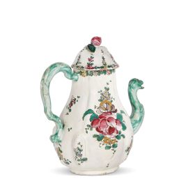 in maiolica dipinta in policromia a terzo fuoco, corpo piriforme lievemente costolato, versatoio a forma di testa di drago e presa “a orecchio” entrambi dipinti in verde chiaro, coperchio a cupola con presa a forma di frutto. Il decoro mostra due mazzi di fiori disposti a scalare lungo il corpo della caffettiera, mentre una sottile ghirlanda di fioretti orna l’orlo del contenitore e si estende sul coperchio salendo verso la presa. Firma Jaques Boselly in bruno di manganese sotto il piede; alt. cm 23,6, diam. piede cm 8,8