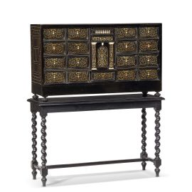 in legno ebanizzato e filettato in osso, fronte centrato da vano apribile a sportello sormontato da ringhierina e cassetto inferiore e affiancato da una doppia colonna di quattro cassetti ciascuna. L'intera superficie mostra un fitto decoro a racemi sviluppati su ciascun cassetto intorno al pomello centrale e chiusi nella parte superiore da un'arpia stilizzata, cm 58x98x31; completo di base con gambe a torchon non pertinente, cm 64x102x36