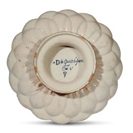 in maiolica dipinta in policromia, corpo sagomato con umbone rilevato, piede alto iscritto al centro in corsivo Dio Quando formò / Eva. Sul fronte a piena superficie è raffigurata la Nascita di Eva dalla costola di Adamo addormentato, secondo l'iconografia derivata dalla xilografia contenuta nella Bibbia di Lione datata 1554 con illustrazioni di Bernard Salomon. Tale soggetto è stato replicato altre due volte dallo stesso pittore, in un esemplare conservato preso il museo civico di Rimini e l'altro al Fitzwilliam Museum di Cambridge, ottenendo tre opere molto simili tra loro divergenti soltanto il alcuni dettagli dell'ambientazione naturalistica e del terreno in primo piano; diam. cm 27, diam. piede cm 13,8, alt. cm 7,5